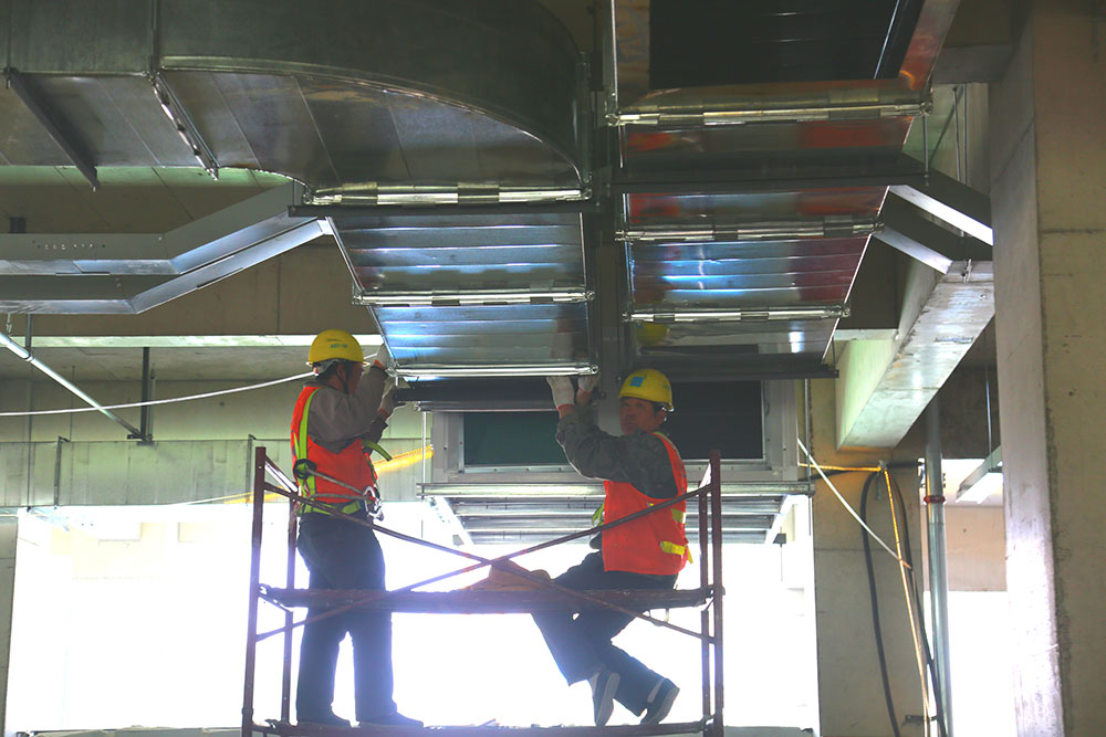 工人在室內(nèi)安裝通風(fēng)系統(tǒng)
