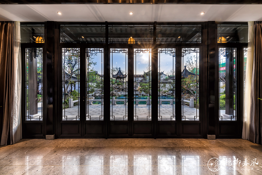 另一套大戶型樣板房采用新中式風格,以儒家思想為依托,通過大理石、金屬銅、木材的有機結合,體現主人的穩重、尊貴和優雅。約110㎡的大面積庭院,演繹著四季不落幕的錦繡風光;挑高約5.7米的地下空間,讓格調生活隨心定制。整套樣板房抒寫著文雅靈動的東方氣韻,展現了“中正和雅”的國風意境。