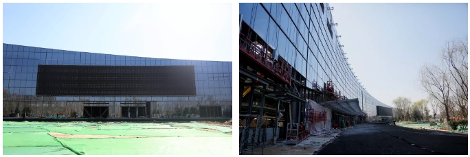 項(xiàng)目建成后,主入口位于展館西側(cè)的共享大廳,南北向的5個(gè)展館通過共享大廳相通,目前共享大廳的玻璃幕墻已安裝完畢,每塊玻璃都按照固定編號(hào)依次安裝,不同弧度的玻璃面完美拼接,將大廳的流動(dòng)設(shè)計(jì)感盡顯無疑。共享大廳外立面的LED大屏頗為搶眼,高約8米、長(zhǎng)約43米的LED大屏日后將用于不同展館布展介紹情況等宣傳使用。在室外部分,正在進(jìn)行廣場(chǎng)綠化和管道鋪設(shè)等施工,工人們有條不紊地完善著室外施工細(xì)節(jié)。