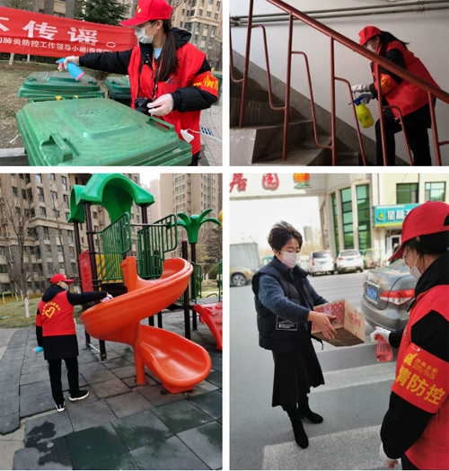 在做好志愿服務之余,志愿者們采用1:200配比的84消毒液堅持每天兩次對社區廣場健身器材、垃圾桶把手、樓道等重點區域進行消毒,為社區居民創造健康、安全的文體活動環境,筑牢疫情防控安全防線。