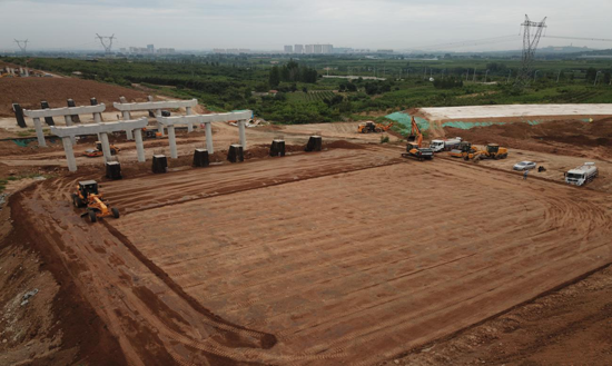 大東環(huán)二標段路基總挖方223.77萬方,總填方309.7萬方。為了確保項目建設的順利進行,項目部及早安排部署,從2018年底正式開展路基施工,從測量放樣、原地面清表、挖土方、填土方等各個環(huán)節(jié)都做到有條不紊、有序推進,積極利用有利天氣,挖掘機、推土機、壓路機等來回穿梭轟鳴,并進行積極協(xié)調,確保各個工作面都有機械運轉,大大提高了施工速度,同時進行細節(jié)把控,路基邊部采用液壓夯補強、搭接部位鋪設土工格柵、軟土地基采取摻灰處理等,推進進度同時保證了工程質量。10月7日完成全部路基施工任務。