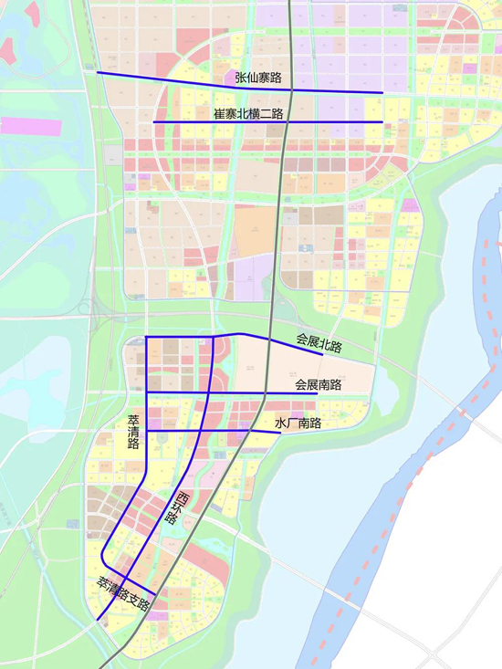 崔寨組團:萃清路支路、水廠南路、會展南路、會展北路、崔寨北橫二路、張仙寨路、萃清路、西環路。