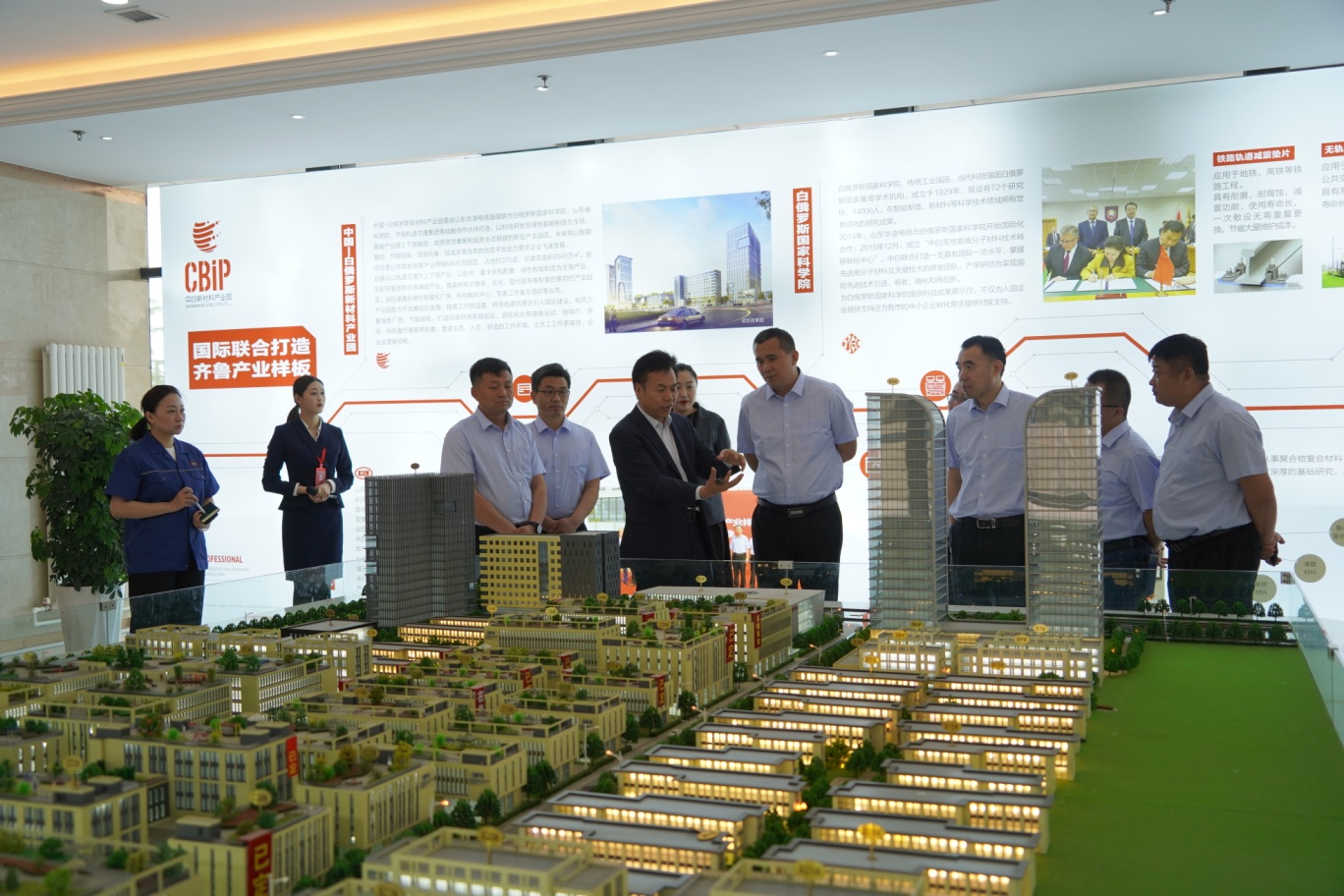 考察團首先參觀了中白新材料產業園展廳,聽取了華凌電纜副總經理王兆濤對產業園建設理念等情況的介紹。中白新材料產業園是華凌電纜聯合白俄羅斯國家科學院等戰略伙伴,集中優勢資源,打造的以軌道交通、高鐵、汽車等領域配套,及高端裝備制造等新材料為主導的綠色制造產業園區。園區配備專業管理團隊,運用“七減一加一支撐”理念為入駐企業提供全方位、一體化服務,力求打造一個讓老板省心、員工舒心的智能化產業園區。
