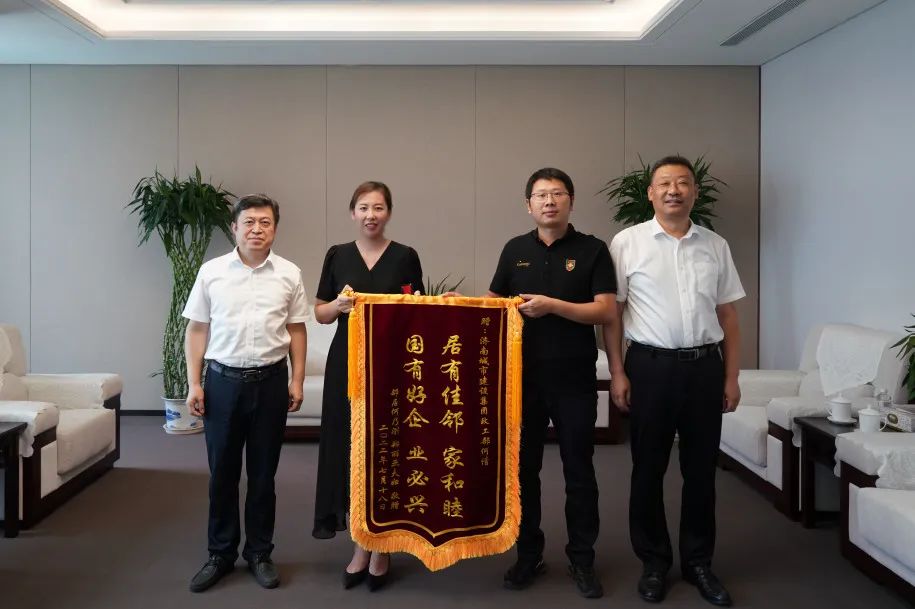 7月18日,一面印有“居有佳鄰家和睦 國有好企業必興”的錦旗送至建設集團,這是濟南市民何先生對集團職工何倩給予其妻子的及時幫助表示誠摯的感謝。集團黨委副書記鐘善良、政工部負責同志出席活動。