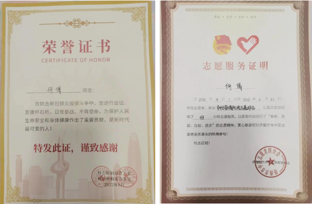 在疫情防控期間,何倩主動請纓,逆行出征,協助桿石橋街道完成核酸檢測、物資搬運等疫情防控工作,得到了社區的高度認可。