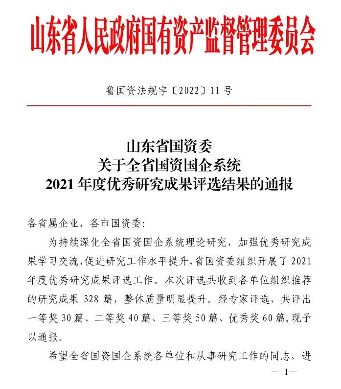 濟南城市建設集團榮獲全省國資國企系統2021年度優秀研究成果一等獎