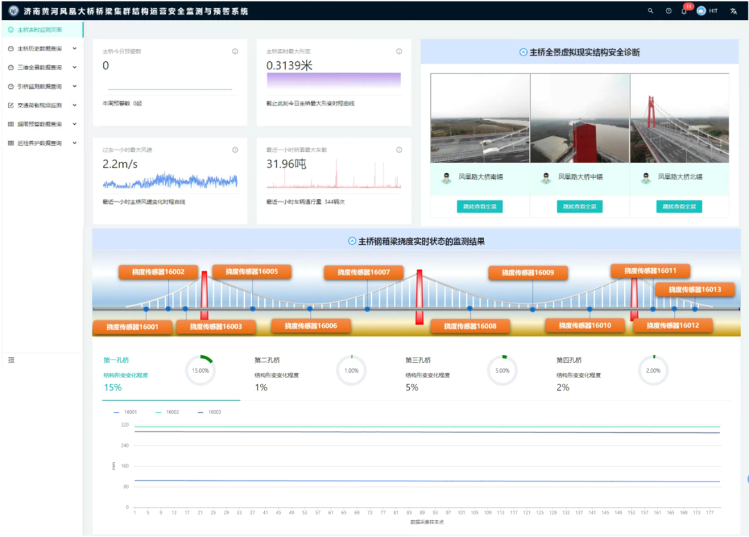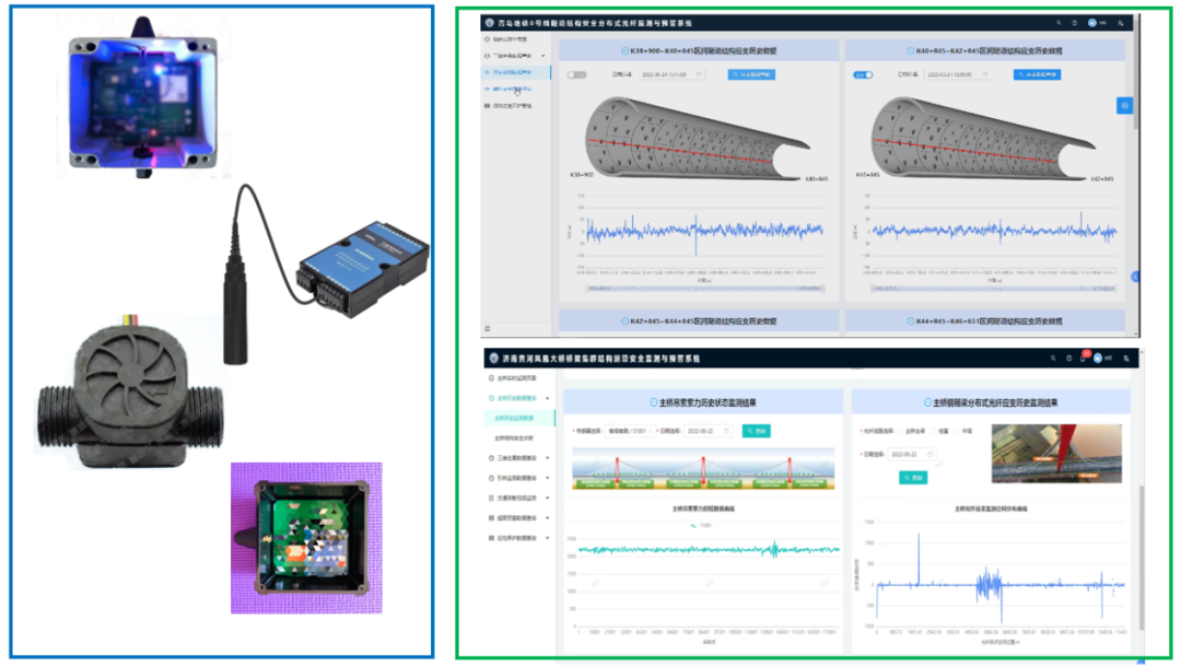 同樣,在濟南黃河鳳凰大橋也搭建了“橋梁集群結構運營安全監測與預警系統”,利用分布式布里淵光纖傳感技術,建立橋梁集群結構應變傳感網絡,利用點式傳感技術,監測橋梁集群結構響應與環境荷載信息。
