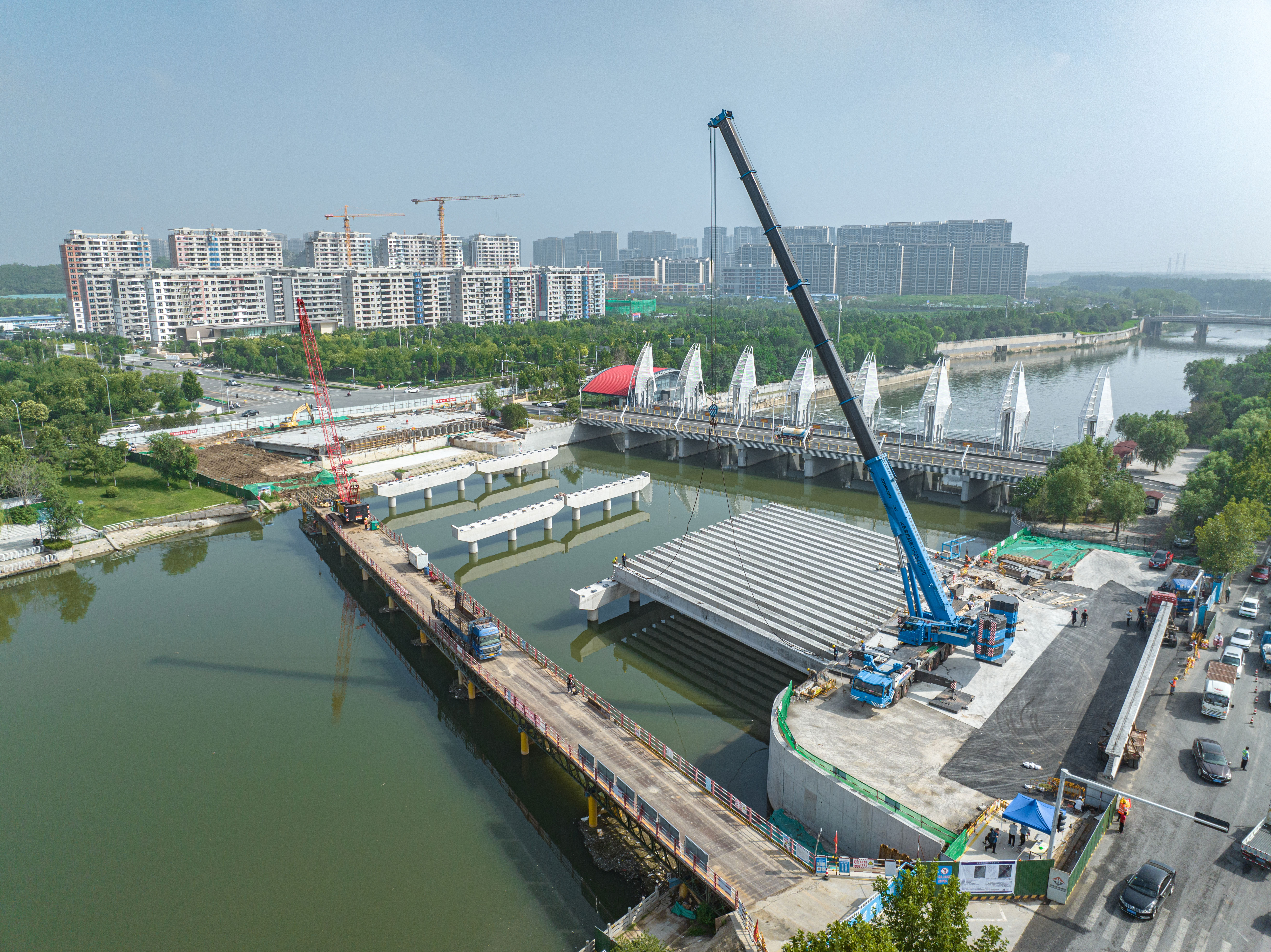 本工程榮獲山東省建設(shè)工程優(yōu)質(zhì)結(jié)構(gòu)獎。項(xiàng)目在施工過程中采用多項(xiàng)先進(jìn)施工工藝,鉆孔灌注樁應(yīng)用成孔檢測儀確保大直徑樁基成孔質(zhì)量,應(yīng)用“灌無憂”檢測設(shè)備,確保樁頭混凝土施工質(zhì)量合格,Ⅰ類樁率100%;蓋梁采用“雙抱箍”無支架模板支撐體系,安全穩(wěn)固,快捷高效;跨河段梁板采用架橋機(jī)吊裝,創(chuàng)新采用“雙支撐矩形”臨時(shí)沙箱支座,確保球形支座上工字梁穩(wěn)定;同時(shí)采用方鋼框架和精軋螺紋鋼對運(yùn)梁通道進(jìn)行加固,確保梁板逐跨順利架設(shè)。